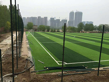 (2)足球場圍網畫線:比賽場地應按照平面圖畫出清晰的線條。線寬不得超過12厘米,不得做成\U+201CV\U+201D形凹槽。較長的兩條線叫邊線,較短的兩條線叫球門線。場地中間畫一條橫穿球場的線,叫中線。場地中央應當做一個明顯的標記,并以此點為圓心,以9.15米為半徑,畫一個圓圈叫中圈。場地每個角上應各豎一面不低于1.50米高的平頂旗桿,上系小旗一面;相似的旗和旗桿可以各豎一面在場地兩側正對中線的邊線外至少1米處。