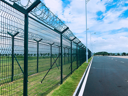 飛行區鋼筋網圍界網面是由直徑5mm的鋼筋排列成矩形網格點焊形成,相鄰橫筋間距不大于10cm,相鄰豎筋間距不大于5cm.每片鋼筋網片寬度不大于3m,用螺栓固定在事先埋設好的立柱上.為增加圍界的穩定性,一般每30m左右增加一個斜撐.圍界上部50—60cm以30.一45.角向外傾斜,或設置滾筒形刺鐵絲網防止攀越。